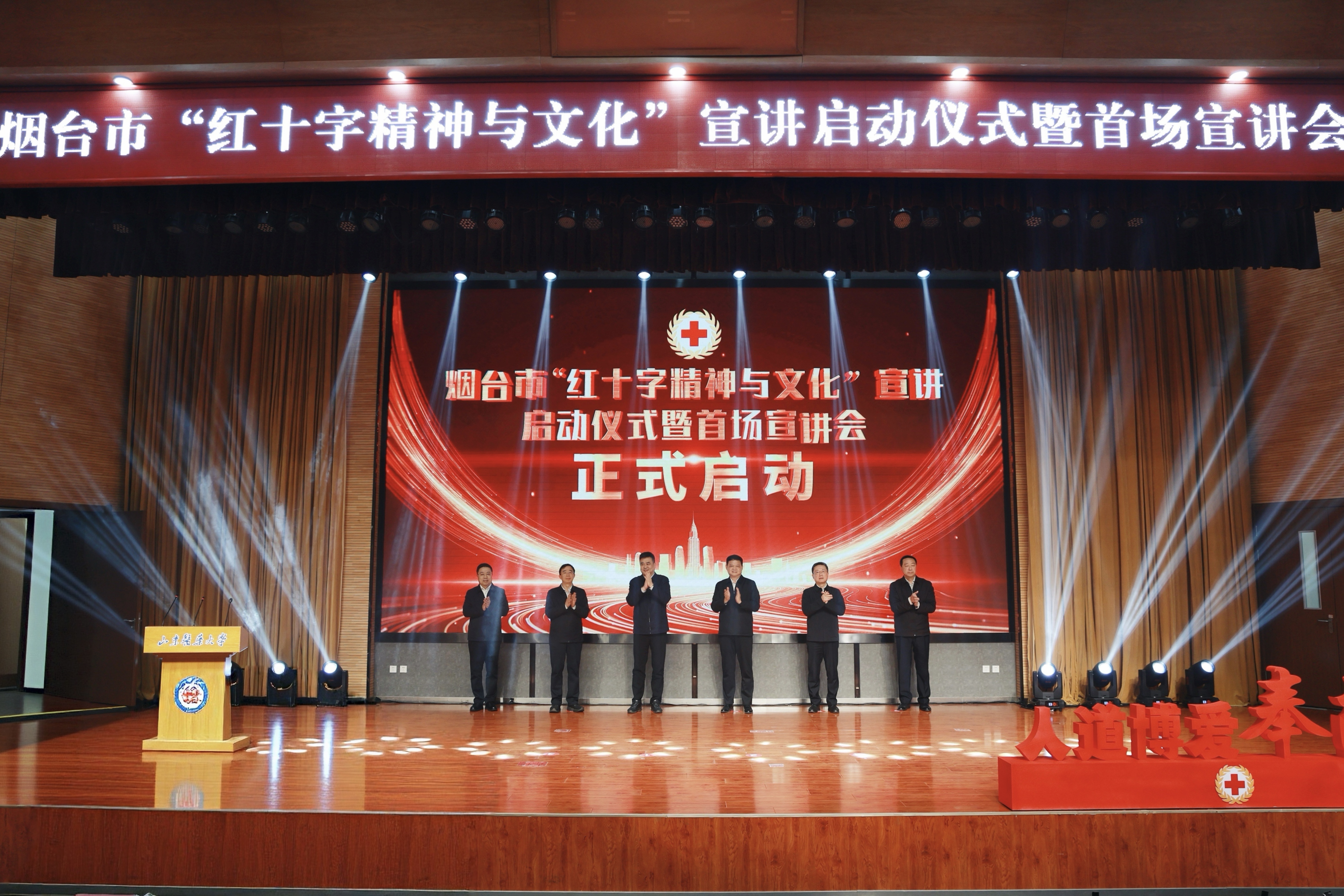 3月31日,烟台市“红十字精神与文化”宣讲启动仪式暨首场宣讲会在学校荣祥楼举行。中国红十字会总会党组成员、副会长兼秘书长李立东,山东省红十字会党组书记、常务副会长白同禹,烟台市委常委、宣传部部长吕波,学校党委书记孙祥军,烟台市红十字会、共青团烟台市委、烟台市委教育工委、烟台市卫生健康委员会相关领导,市融媒体中心、驻烟19所高校代表、各区市红十字会负责人以及学校师生代表等参加启动仪式。